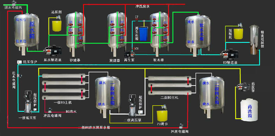 本公司純水設(shè)備工藝流程:原水→活性碳過(guò)濾器→軟化過(guò)濾器→精密過(guò)濾器→反滲透系統(tǒng)→純水箱。